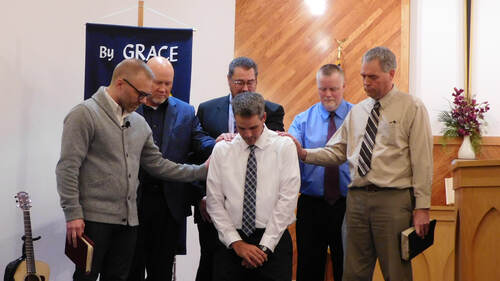 Pictured (L-R): North American Mission Associate Director Rev. Jordan Spina, Elder Jeff Keveland, Pastor Jeremy Wilson, Elder Joel Monsen, and Elder Dan Knudsen praying over Elder Greg Kollmann (center).