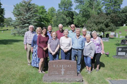 Kaardal descendants meeting with CLB representatives at the grave of Jetmund and Sofie Kaardal.