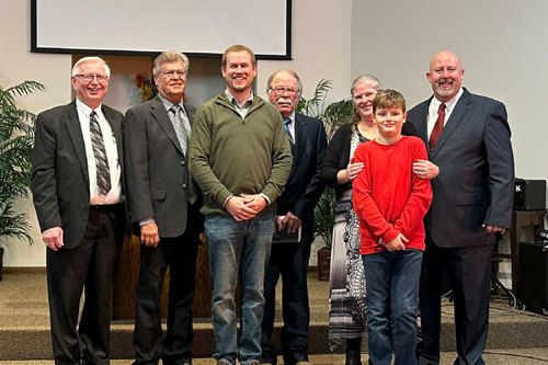 L to R: Dr. Eugene Boe; Elders Kenneth Roed, Charles Strand, Paul Carlson; Mitzi, Gideon, and Rev. Mars Harper.