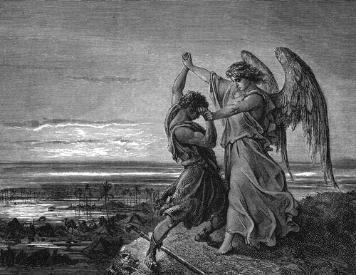 Esau, somehow aware that Jacob is returning, has come down the road to meet his younger brother. Esau is accompanied by a large contingent of people. They are capable of doing serious harm to Jacob, who now has a growing family, including little children. The night before the two groups will meet on the road, Jacob tosses and turns, trying to sleep. God comes to him, somehow in tangible form, as an angel. Jacob grabs hold of God. It sounds pretty strange, but maybe you know the feeling. We often struggle with each other for dominance or advantage. But what exactly was going on, that a man should struggle with God?